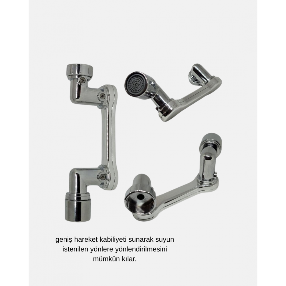Gelişmiş 1080° döner başlıklı musluk aparatı, günlük yaşamda su kullanımını daha konforlu hale getirir. 360° üst ve alt eksen dönüşü sayesinde suyu lavabonun her noktasına yönlendirebilir, temizlikte zorluk çekmeden etkili bir yıkama elde edebilirsiniz. Geniş açılı tasarımı sayesinde büyük tencereleri veya lavaboyu durulamak artık çok kolay. Yüksek kaliteli paslanmaz çelik ve pirinç malzemeden üretilmiştir; paslanmaz, dayanıklı ve uzun ömürlüdür. Musluk ucundaki filtreli perlatör, suyu hava ile karıştırarak hem güçlü hem de yumuşak bir akış sağlar. Bu sayede %30’a varan su tasarrufu elde edilir. Şık krom kaplamasıyla modern bir görünüm kazandırır. El-yüz yıkama, sebze temizliği ve lavabo durulama işlemlerinde maksimum hijyen ve rahatlık sunar. Evde profesyonel düzeyde konfor isteyenler için mükemmel bir çözümdür.