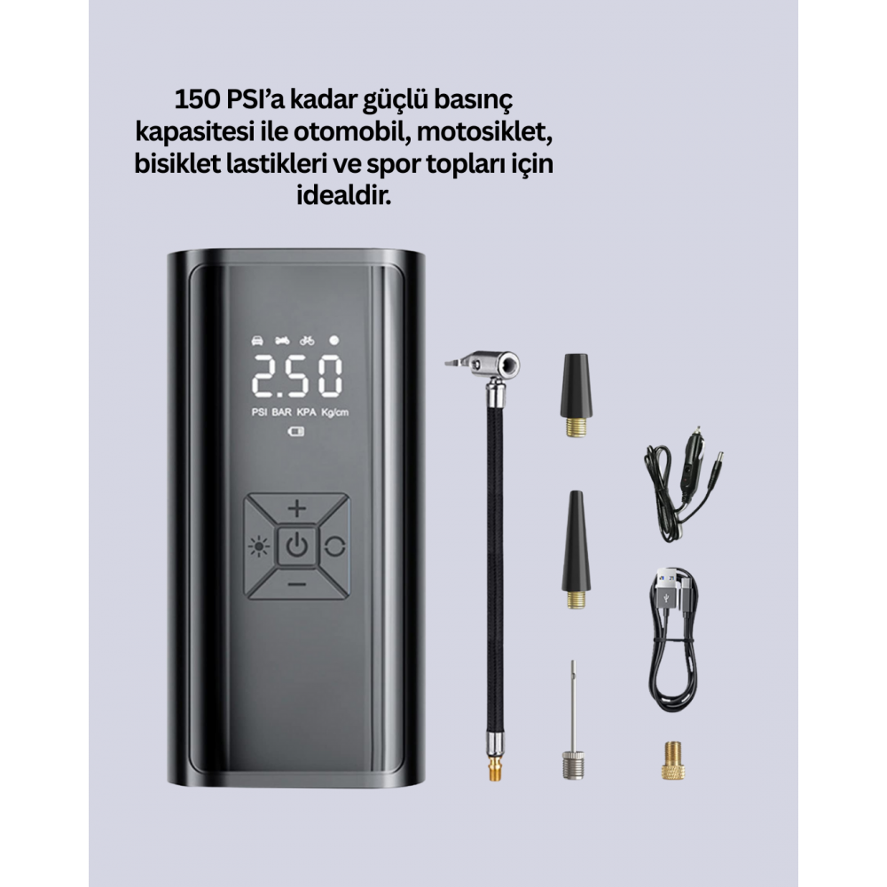 Dijital Ekranlı Şarjlı Hava Kompresörü 150 PSI Güçlü Motorlu