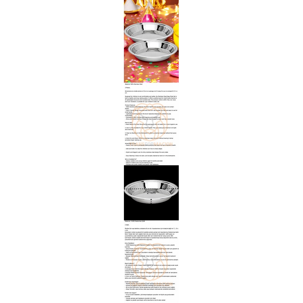 Turk Çocuk Tabağı Güvenli Kenarlı Çelik 2 Adet 21 cm