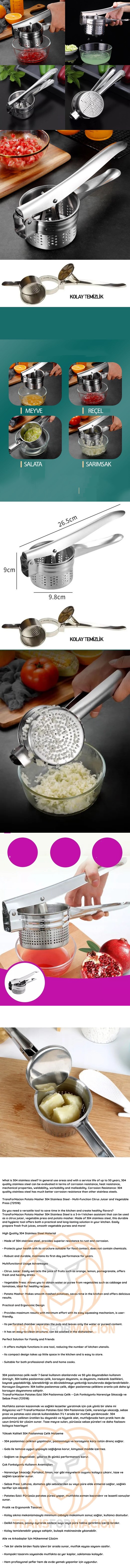 Mutfakta zaman kazanmak ve sağlıklı lezzetler yaratmak için çok yönlü bir alete mi ihtiyacınız var? HSNET Patates Ezici 304 Paslanmaz Çelik, narenciye sıkacağı, sebze presi ve patates ezici olarak kullanılabilen 3’ü 1 arada bir mutfak yardımcısıdır. 304 paslanmaz çelikten üretilen bu dayanıklı ve hijyenik alet, mutfağınızda hem pratik hem de uzun ömürlü bir çözüm sunar. Taze meyve suları, pürüzsüz sebze püreleri ve daha fazlasını kolayca hazırlayın!