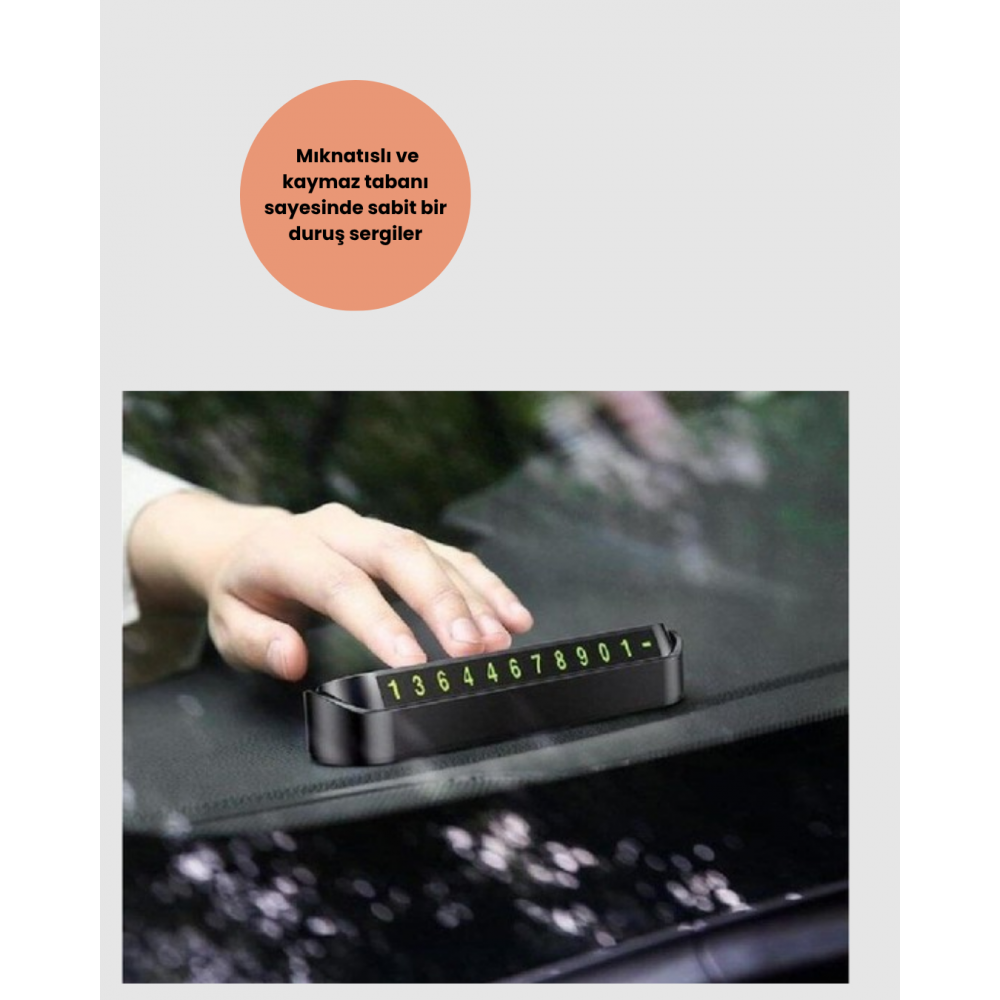 Araç içinde pratik bir kullanım sunan bu fosforlu park numaratörü, gece ve gündüz fark etmeksizin telefon numaranızın görünür kalmasını sağlar. Özellikle kısa süreli park durumlarında iletişimi mümkün kılar, sizi olası çekilme, engelleme ya da acil durumlar gibi risklerden korur.Fosforlu yüzeyi sayesinde karanlık ortamlarda dahi net görünüm sunar. Işık yansımasına gerek kalmadan numaralar kolayca okunur. Bu sayede gece parklarında da etkili şekilde çalışır.Montaj gerektirmeyen yapısı sayesinde saniyeler içinde kullanıma hazır hale gelir. Gösterge paneline veya ön cama sabit şekilde yerleştirilir. Aracınızın iç tasarımına şık ve modern bir detay ekler.Kompakt tasarımı ile görüş alanını engellemez, sürüş güvenliğini tehdit etmez. Kaliteli ve dayanıklı malzemelerden üretildiği için uzun ömürlüdür; zamanla solma ya da deformasyon göstermez.