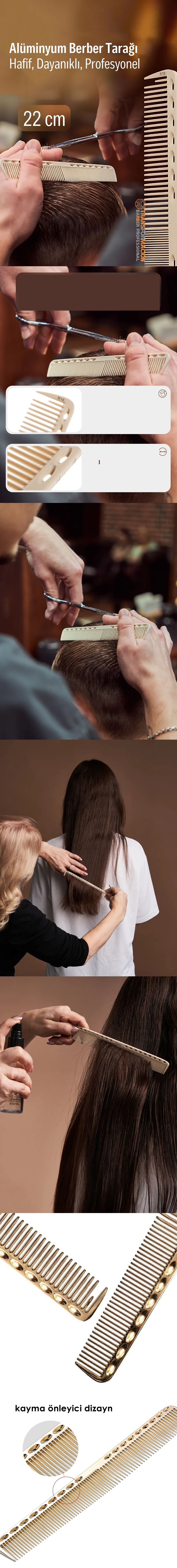 22 cm uzunluğundaki bu profesyonel berber tarağı, yüksek kaliteli alüminyum malzemeden üretilmiştir.