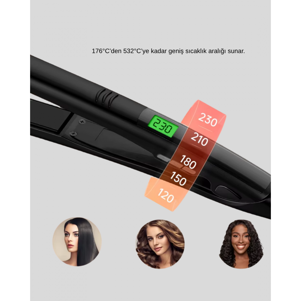 Evde profesyonel düzeyde saç şekillendirme deneyimi sunan Isı Ayarlı Saç Düzleştirici, üstün teknoloji ve yüksek ısı performansını bir araya getiriyor.Titanyum kaplı seramik plakalar, ısıyı eşit biçimde dağıtarak saçın zarar görmeden pürüzsüzleşmesini sağlar.176°C – 532°C arasında ayarlanabilir sıcaklık aralığı, her saç tipine uygun ısı seçeneği sunar.İnce telli saçlar için düşük, kalın ve kıvırcık saçlar için yüksek ısıyla mükemmel sonuçlar elde edebilirsiniz.Nem koruma sensörü, saçın doğal nem seviyesini algılayarak sıcaklığı otomatik şekilde ayarlar.Bu sayede saçın nem dengesi korunur, yıpranma riski azalır.360° dönebilen kablo ve 2.5 metre uzunluk, kullanım sırasında maksimum hareket özgürlüğü sunar.Kablo karışıklığına son vererek profesyonel kullanım kolaylığı sağlar.Dijital ekranı, sıcaklık kontrolünü net biçimde gösterir ve hassas ayar yapmanızı kolaylaştırır.Ergonomik tasarımı, elinizi yormadan uzun süreli kullanım imkânı tanır.Güvenlik kilidi, taşıma sırasında cihazın korunmasını sağlar.Seyahat dostu kompakt yapısı ile her an yanınızda.Isı Ayarlı Saç Düzleştirici, hem profesyonellerin hem de evde bakımına özen gösterenlerin favorisi olacak.