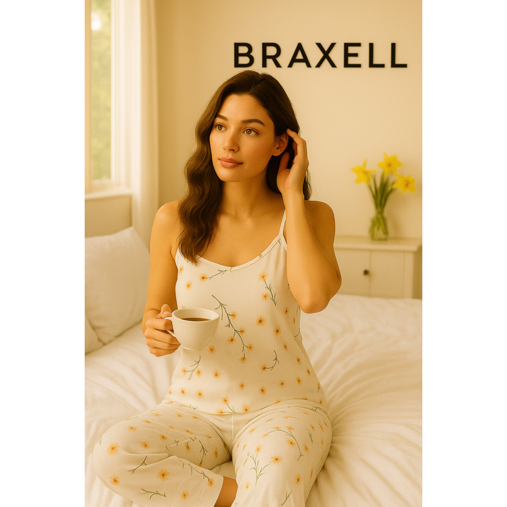 - Rahat kesimi ile günlük kullanım için ideal, beyaz ip askılı çiçek desenli pijama takımı.; - materyali sayesinde esnek ve konforlu bir deneyim sunar.; - Homewear koleksiyonuna ait bu takım, ev ortamında şıklığı ve rahatlığı bir arada yaşamanızı sağlar.; - Basic siluetiyle her vücut tipine uyum sağlayarak rahat bir kullanım imkanı tanır.; - 30 derecede yıkama talimatına uygun şekilde kolayca temizlenebilir; böylece hijyenik kalmasını sağlar.; - T-shirt-pantolon alt-üst takımı olarak tasarlanmıştır; pratik ve şık kombinler yaratmanızda yardımcı olur.; - özgürce hareket etme özgürlüğü sunar.; - Normal boy uzunluğuyla hem konforlu hem de estetik bir görünüm kazandırır.; - Yetişkin yaş grubuna hitap eden tasarımıyla herkes için uygundur.; - Dokuma kumaş tipi sayesinde dayanıklılığı arttırarak uzun süreli kullanım vaat eder.; - Askılı kol boyu ile yaz aylarında serinlik hissi verirken aynı zamanda zarif duruş sergiler.; - Kadın / kız cinsiyetine yönelik olarak üretilmiş olup feminen detaylarıyla dikkat çeker.; - TR menşeli olmasıyla yerel üretim avantajlarından faydalanmanızı sağlar.; - 2 parçadan oluşan set halinde gelmesiyle bütünsel bir görünüm elde etmenize olanak tanır.; - Günlük ortamlarda rahatlıkla tercih edebileceğiniz bu pijama takımı, ev giyiminizin vazgeçilmez parçası haline gelir.; - Bürümcük dokuma tipiyle yumuşak dokusuyla teninize nazikçe dokunurken konforundan ödün vermez.; - Likra materyali esneklik kazandırarak vücut hatlarınıza mükemmel uyum sağlar; hareket serbestliği sunar.; - Baskılı deseniyle göz alıcı detaylar ekleyerek stil sahibi görünümünüzü pekiştirir.; - U yaka tasarımının sunduğu modern çizgiyle boynunuza zarif bir çerçeve oluştururken rahatlık sunar.; - Düz paça tipiyle basit ama şık bir görünüm elde etmenize yardımcı olur; ayakkabı seçiminizi ön plana çıkartır.;
