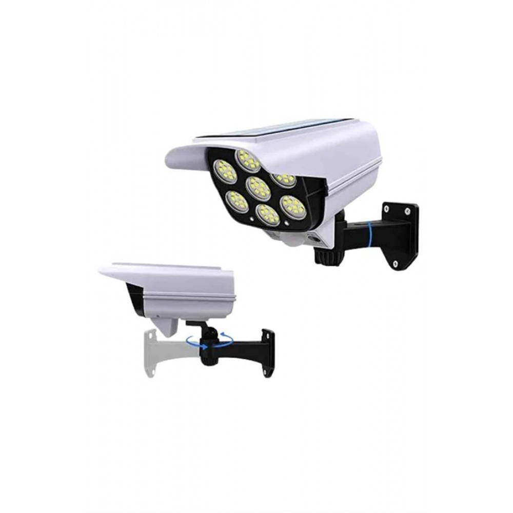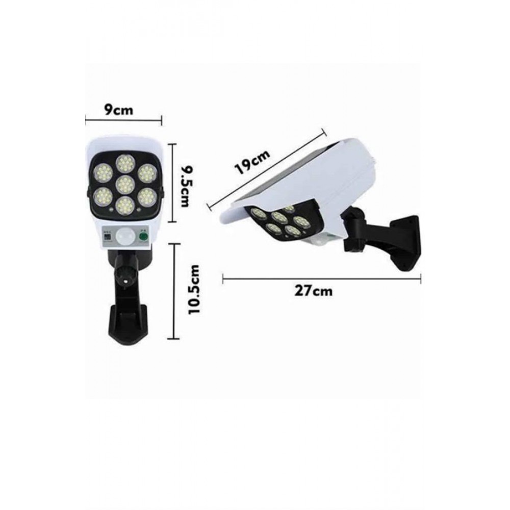 Çift Fonksiyonlu TasarımSahte güvenlik kamerası görünümü sayesinde caydırıcı bir etki yaratırken, aynı zamanda güçlü LED aydınlatmasıyla bahçenizi veya dış mekanınızı aydınlatır. Hem güvenlik hem de dekoratif amaçlı kullanım için idealdir. Güneş Enerjisi ve Uzun Süreli Pil Kullanımı2400mAh yüksek kapasiteli pili sayesinde düşük ışık modunda 40 saate kadar kesintisiz çalışabilir. Ek olarak, güneş paneli sayesinde güneş ışığını emerek enerji tasarrufu sağlar, çevre dostu bir kullanım sunar. Akıllı Hareket Sensörü ile Otomatik AydınlatmaDahili PIR hareket sensörü, 10-20 fit mesafede ve 120 derece aralığında hareket algıladığında ışığı otomatik olarak tetikler. Bahçe, garaj, sundurma veya çim alanlar için mükemmel bir güvenlik aydınlatması sunar. Kolay Kurulum ve Suya Dayanıklı YapıIP66 su geçirmez özelliği sayesinde zorlu hava koşullarına karşı dayanıklıdır. 5 eksenli dönebilen tasarımı ile güneş panelinin ve ışık açısının en iyi şekilde ayarlanmasını sağlar. Kolay montaj imkanı sunarak pratik bir kullanım deneyimi yaşatır.