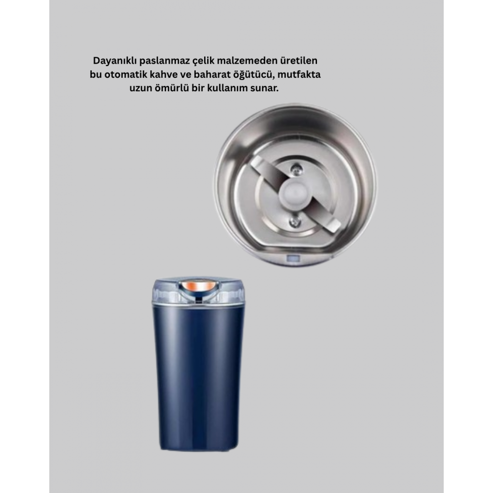 Dayanıklı paslanmaz çelik malzemeden üretilen bu otomatik kahve ve baharat öğütücü, mutfakta uzun öm..