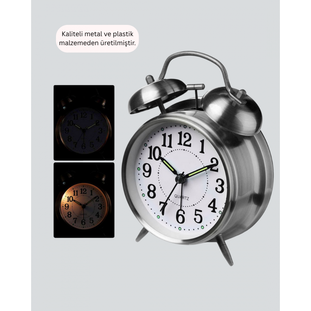 Gümüş Renkli Sessiz Işıklı Dekoratif Masa Üstü Çalar Saat Alarmlı