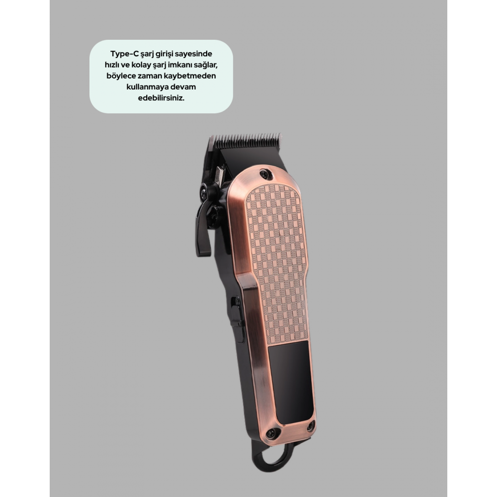 Yüksek performans ve konforu bir araya getiren bu profesyonel saç kesim makinesi, kişisel bakımda fark yaratmak isteyenler için tasarlandı. 7000RPM güçlü motoru, tıraş sırasında takılma veya yavaşlama olmadan pürüzsüz bir kesim deneyimi sunar. Bu hız, özellikle kalın ve yoğun saç tiplerinde bile üstün performans sağlar.Type-C şarj girişi, hızlı ve pratik şarj imkânı tanır. Uzun kablolarla uğraşmadan yalnızca birkaç saatte tam şarj olur ve 3 saate kadar kesintisiz kullanım sunar. LCD ekranı, batarya seviyesi ve hız ayarlarını anlık olarak takip etmenizi sağlar.Cihaz, 4 kademeli hassas uzunluk ayarı ile saç, sakal ve vücut tıraşında kişisel tercihlerinize göre şekillendirme yapmanıza olanak tanır. Kuru kullanım özelliği, suya gerek kalmadan pratik tıraş deneyimi sunar.Ergonomik tasarımı ve şık siyah görünümü modern bir tarz oluşturur. Hafif yapısı sayesinde elinizde rahatça kavranır ve uzun süreli kullanımda yormaz.Dünya genelinde kullanılabilen F tipi priz uyumluluğu, seyahatlerde büyük avantaj sağlar.Profesyonel tıraş performansını ev konforuna taşıyan bu cihaz, hem pratik hem güçlü bir bakım çözümüdür.