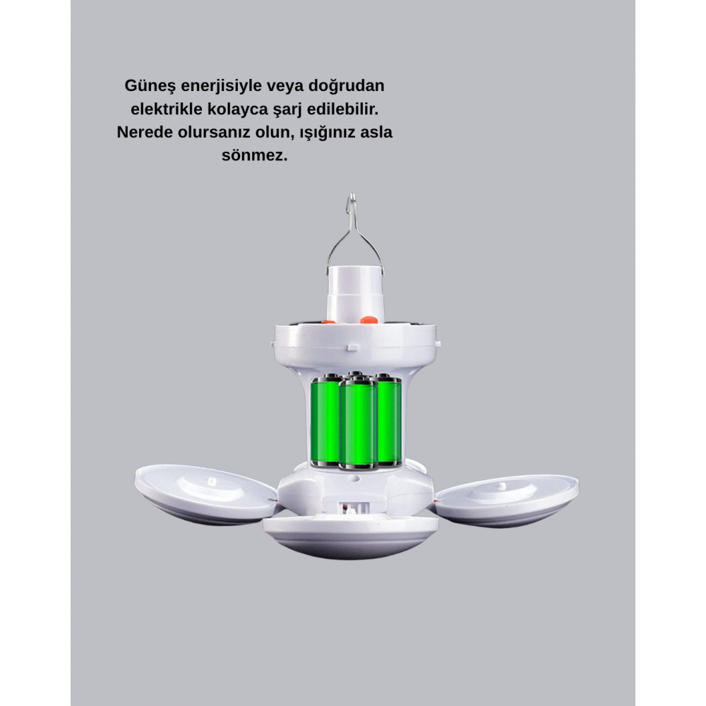 Yenilikçi 5 kanatlı tasarımıyla bu solar kamp lambası, klasik lambalara göre çok daha geniş bir aydı..