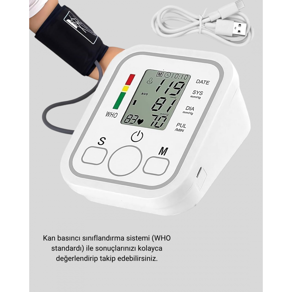 Sağlığınızı evinizin konforunda profesyonel hassasiyetle takip etmek ister misiniz?Bu üst koldan ölçüm yapan dijital tansiyon aleti, gelişmiş sensör sistemiyle doğru ve güvenilir ölçüm sonuçları sunar.IHB aritmi tespit özelliği, sadece tansiyonu değil, aynı zamanda düzensiz kalp atışlarını da algılayarak sizi olası riskler konusunda bilgilendirir.Geniş LCD dijital ekran, büyük ve net sayılarla sonuçları kolayca okumanızı sağlar.WHO standartlı kan basıncı sınıflandırma sistemi, ölçüm sonuçlarını renkli göstergelerle değerlendirmenizi kolaylaştırır.Bu sayede her ölçümde değerlerinizin normal, düşük veya yüksek aralıkta olduğunu anında görebilirsiniz.Cihaz, 2x99 hafıza kapasitesi ile iki farklı kullanıcının sonuçlarını ayrı ayrı kaydedebilir.Böylece aile bireyleri için de ortak bir çözüm sunar.Nabız tarama ve osilometri teknolojileri bir arada kullanılarak ölçüm doğruluğu artırılmıştır.Kompakt ve hafif tasarımı, seyahatlerde rahat taşıma imkânı sağlar.4xAAA pil veya Android uyumlu USB kablo ile çalışabilir.Evde, işte veya yolculukta — her yerde kolay, hızlı ve profesyonel ölçüm imkânı sunar.Sağlık bilincini günlük rutine dönüştürmek isteyen herkes için mükemmel bir seçimdir.