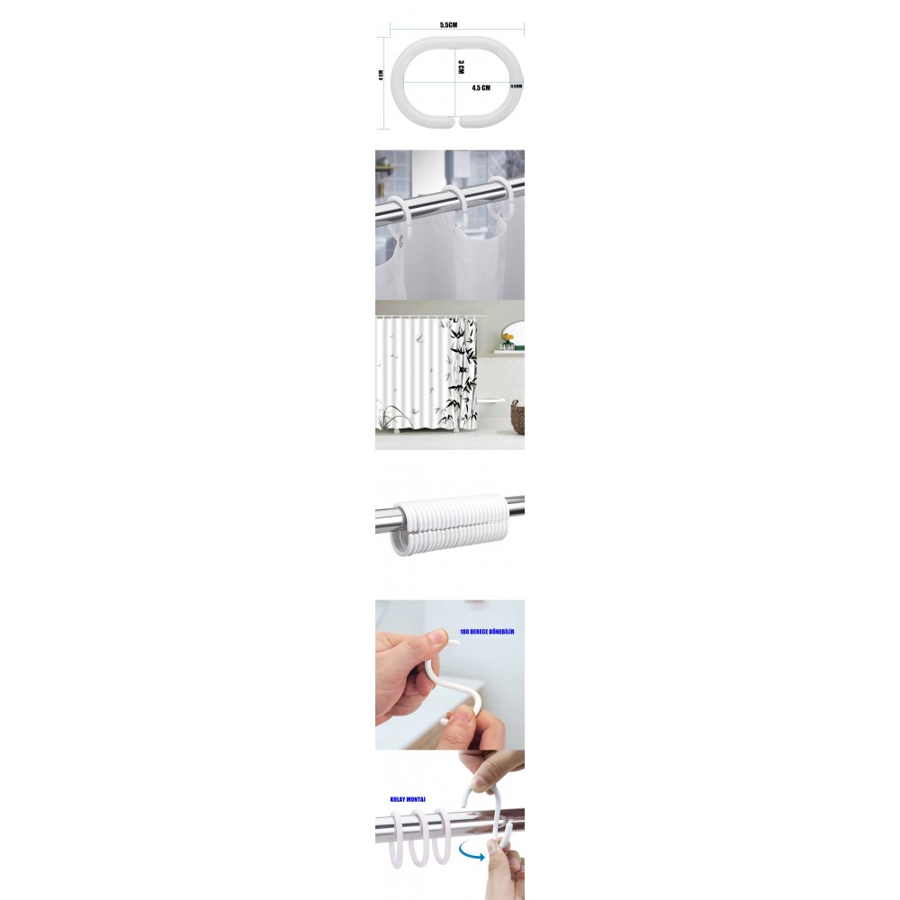 Hafif malzeme : Duş perdesi kancaları, kayması ve çekilmesi kolay ve pürüzsüz olan hafif, yüksek kaliteli plastik malzemeden yapılmıştır.