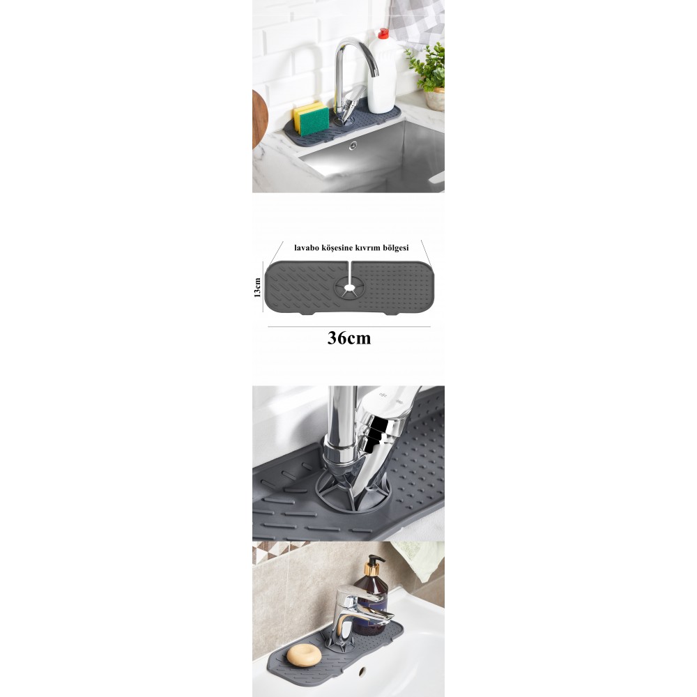 Sadece musluk kurutma matı olarak değil, diş fırçanızı, bardağınızı, el sabununuzu ve bulaşık sabununuzu koyabileceğiniz tasarımda üretilmiştir.