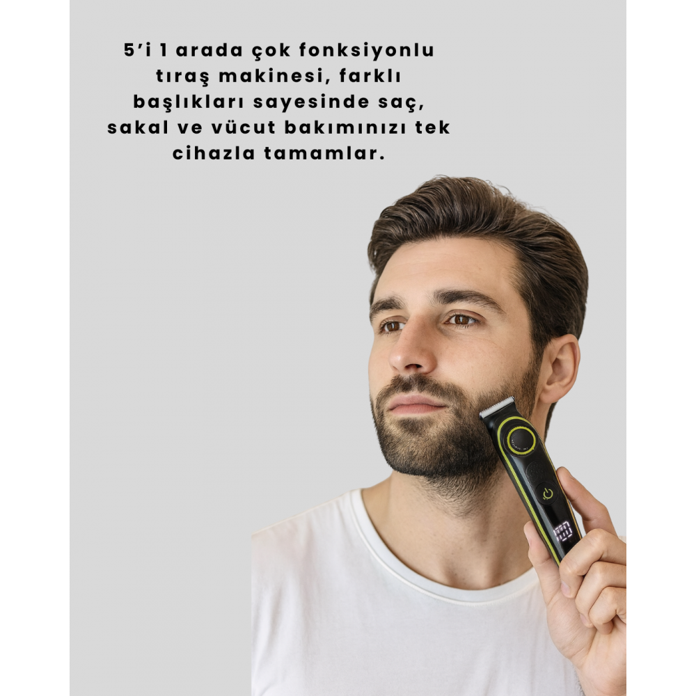 5 başlıklı erkek bakım seti, tüm bakım ihtiyaçlarınıza çözüm sunan çok fonksiyonlu bir cihazdır. Saç..