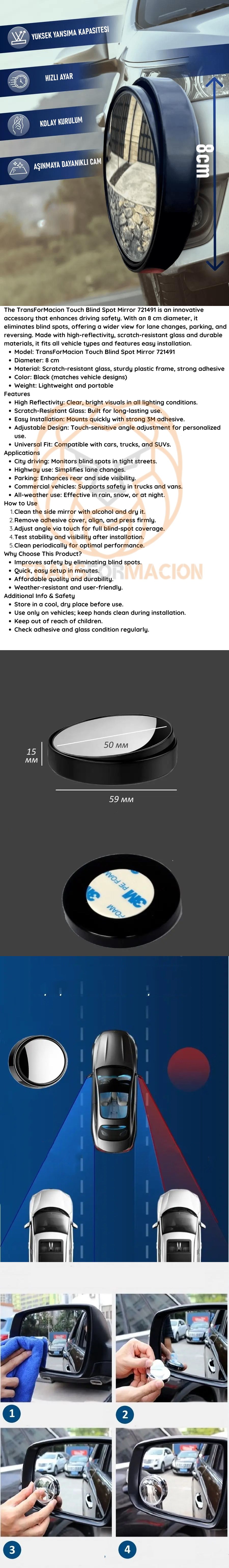 Ürün Özellikleri Bu kör nokta aynası, sürücülerin güvenliğini ön planda tutarak tasarlanmıştır. Geniş görüş açısı ve dokunmatik ayar özelliği ile kullanım kolaylığı sağlar.